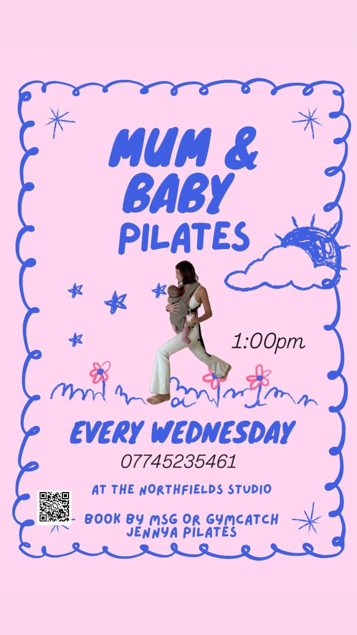 A postnatal recovery class where your baby lies next to you on the mat or can be carried through the workout. Classes are small (max 5 people) and supportive, focusing on strength and recovery after birth. All equipment provided — just bring what you need for your baby. Wait 6 weeks after natural birth or 8 weeks after C-section before joining (consult your GP). Run by Jennifer Aayadi.