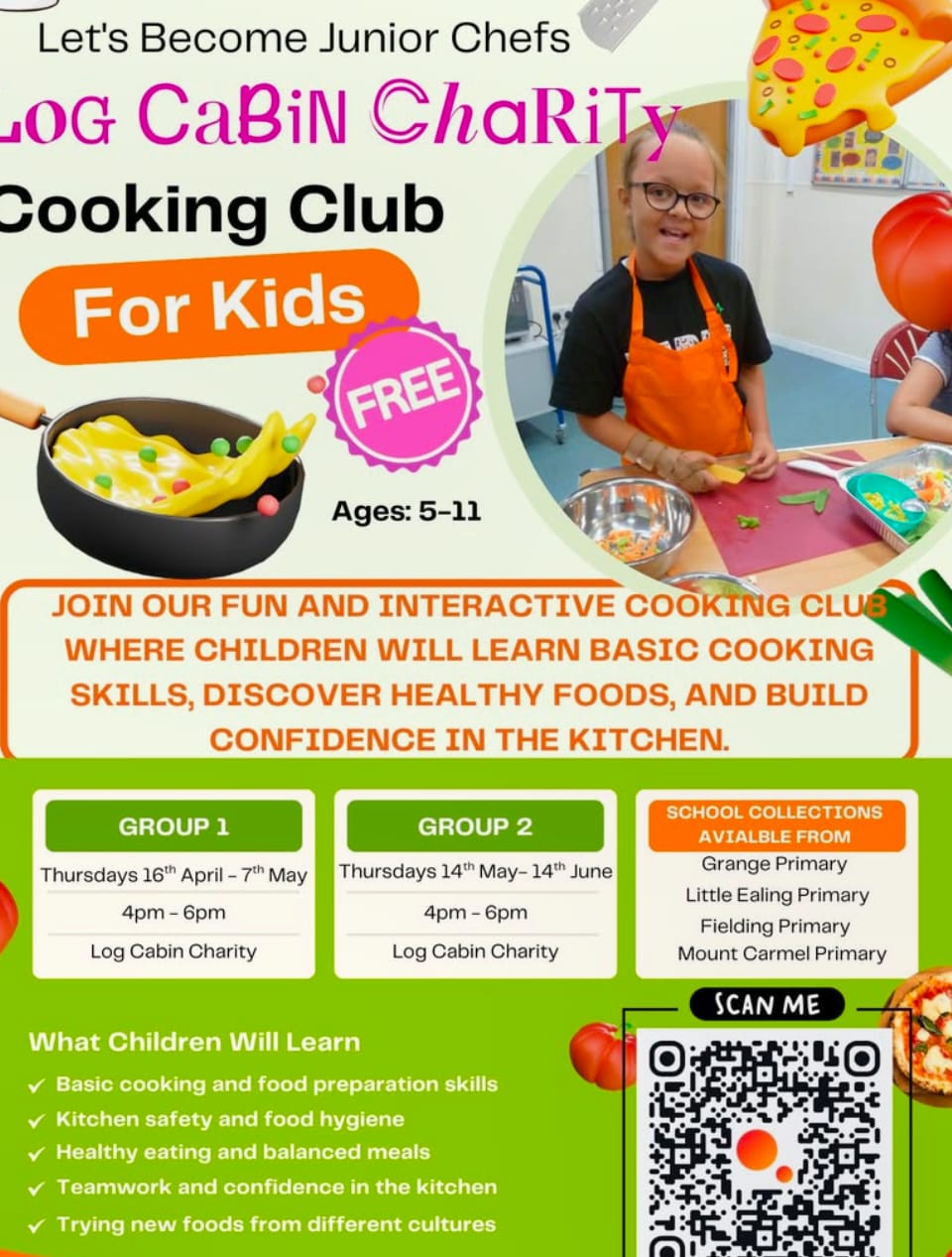 Free 4-week cooking club for children aged 5–11, run by the Log Cabin Charity. Kids learn practical cooking skills, food hygiene and healthy eating in a fun, supportive group. Two groups running after Easter — Group 1: Thu 16 Apr–7 May, Group 2: Thu 14 May–4 Jun 2026.